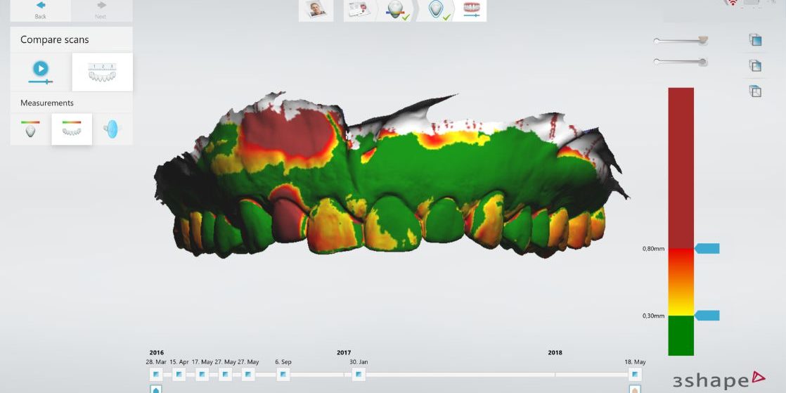 TRIOS Patient Monitoring vous permet de comparer les scans et de prendre des mesures en conséquence et ce rapidement. Interne Daten von 3Shape. Cet outil de suivi dentaire est fourni avec les scanners intra-oraux 3Shape TRIOS à lexception de TRIOS 3 Basic et vous permet de détecter les plus infimes changements lesquels resteraient sinon invisibles.