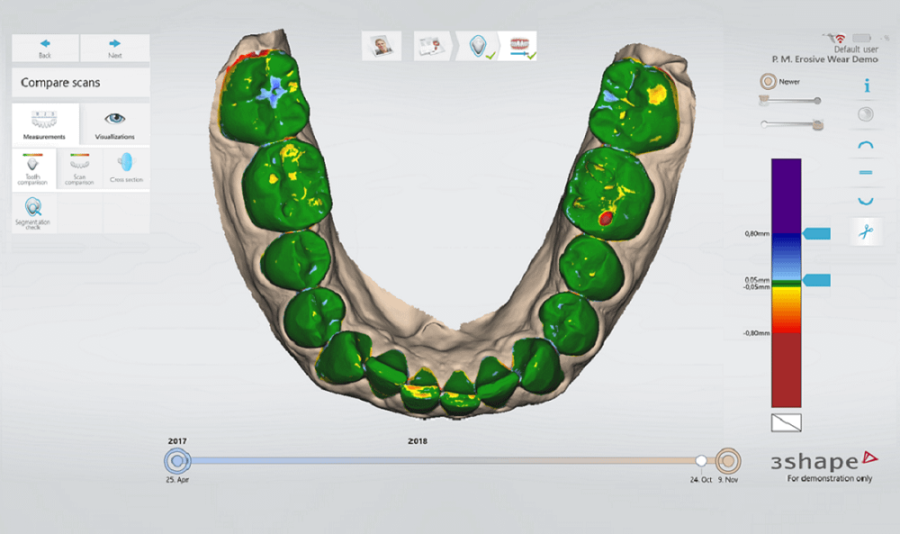 TRIOS Patient Monitoring を使えばスキャンを過去のデータと比較し必要と判断されれば直ぐに治療に移ることができますこのモニタリングツールはすべての 3Shape TRIOS 口腔内スキャナーTRIOS 3 Basic を除く搭載されておりこれがなければ気が付かない小さなな変化を検出できま. TRIOS Patient Specific Motion - allows you to register individual movement of the patients mandible.